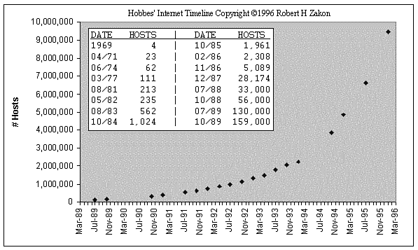 Figure 12.3: This timeline illustrates the rapid growth of Internet hosts.
