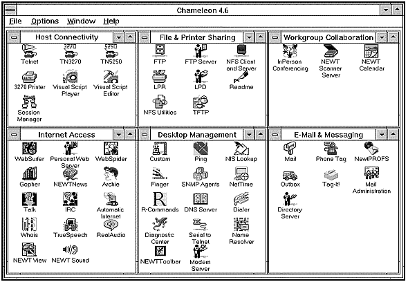 Of course, if you want to purchase a full suite of products for your users, many such suites are available. Netcom, SPRY, Chameleon, FTP Software, and many other large Internet Service Providers (ISPs) and software makers offer such suites, as well as the suites available with operating systems such as Windows 95, Windows NT, OS/2, and Linux. This will probably reduce your technical support and training costs but will increase your up-front software costs. These suites can run as much as $150 to $350 per license, but they come with free or inexpensive technical support. In fact, with some of these suites, you wouldn't need a full-time systems administrator. Figure 13.1 shows an example of a suite of products.