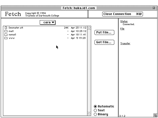 Fetch, shown in Figure 13.15, probably is the most popular FTP client available. It's available only for the Mac, and it has many features. Although PC users have a wide variety of FTP clients available to them that offer comparable applications and features, Fetch currently is the best FTP client available for the Macintosh. I don't know of anyone using another FTP client on a Mac. Fetch has a premium freeware version available on the Internet. Like CuteFTP, Fetch works much like a typical file manager, showing the remote file system and letting users browse their local drives for files and/or directories. One notable feature of Fetch is that it lets you upload and download entire directory trees.