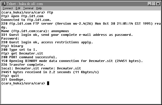 Windows 95, Windows NT, and all UNIX operating systems come with a command-line FTP client. Because it doesn't have a graphical interface, the user must know arcane commands. See Figure 13.16.