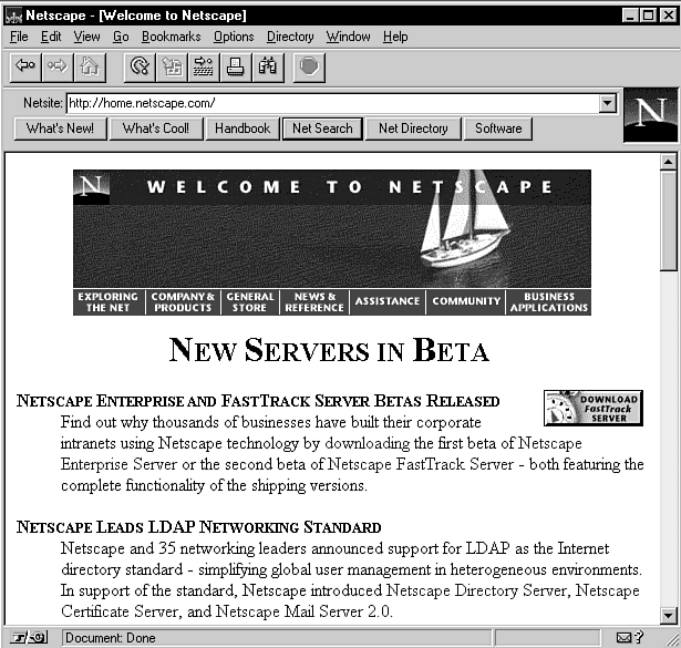 Netscape (shown in Figure 13.5) has been, and probably will be for some time, the single most popular TCP/IP application available. It's available for MacOS, Windows 3.1, Windows 95, Windows NT, and most UNIX platforms, including Linux. It runs well on 8 MB of RAM, and because it incorporates FTP, e-mail, and a newsreader into the browser, it requires fewer applications to run simultaneously when performing several functions. Netscape costs about $50 per user and can be downloaded from the Internet. Beta versions typically are available for free downloads, although these beta versions expire occasionally, leaving thousands of users scrambling to get on the server to download the latest version.
