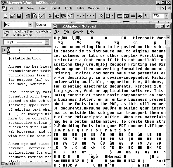 Although in recent years, most good word processing applications such as Microsoft Word and WordPerfect have filters for each other and other popular formats, they are still not perfect. When a document is saved in Microsoft Word, some of the elements of that document are communicated or symbolized by Microsoft Word itself. The fonts, embedded images, columns and tabs, or other complex formatting procedures are saved in a special Microsoft language. This language can be understood by Microsoft Word, and sometimes can be translated by a Microsoft Word filter. To get a better idea of this example, try opening a Microsoft Word document in Notepad. You see a lot of special characters, and all the document's formatting is gone, as shown in Figure 23.1.