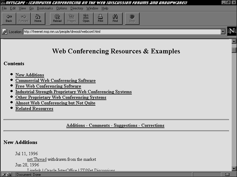 The Well and Table Talk are only two of the many group conferences on the Web. Online discussions, which are not limited by geography, are one example of how the Internet and the Web can serve the world. A few people such as Web guru David Wooley have theorized about the potential of online discussion. Wooley's Web site, shown in Figure 37.5, offers an array of resource links that can be a helpful aid to anyone who is building Web message boards. You can find it at http://freenet.msp.mn.us/people/drwool/Webconf.html.