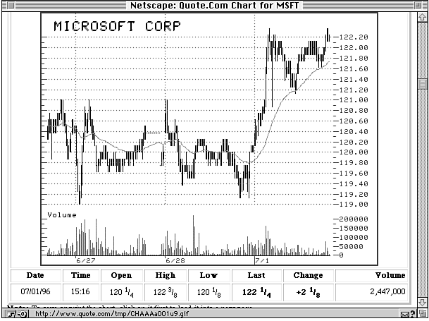 You might not like the idea of your computer talking to you, but you might appreciate other benefits of real-time messaging. It can be a terrific method for keeping up-to-date with stock quotes. Real-time stock updates are already available to those who subscribe to stock-oriented news services like Quote.com, as shown in Figure 39.1.