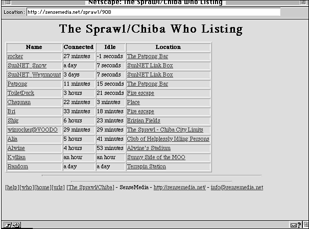 Members of The Sprawl navigate themselves to the chat forum of choice by clicking a series of image maps. These maps provide a graphic environment for The Sprawl, which makes it seem more like a real place than a text-based MOO could. Sprawl members can do most of the things possible in text MOOs, such as check to see what users they've joined online, as shown in Figure 39.4.