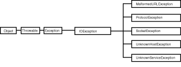 The java.net package handles network communications. Its classes most often throw exceptions to indicate connect failures and the like. Table 10.4 and Figure 10.4 show the recoverable exceptions from the java.net package. The classes of the java.net package do not throw errors at all.