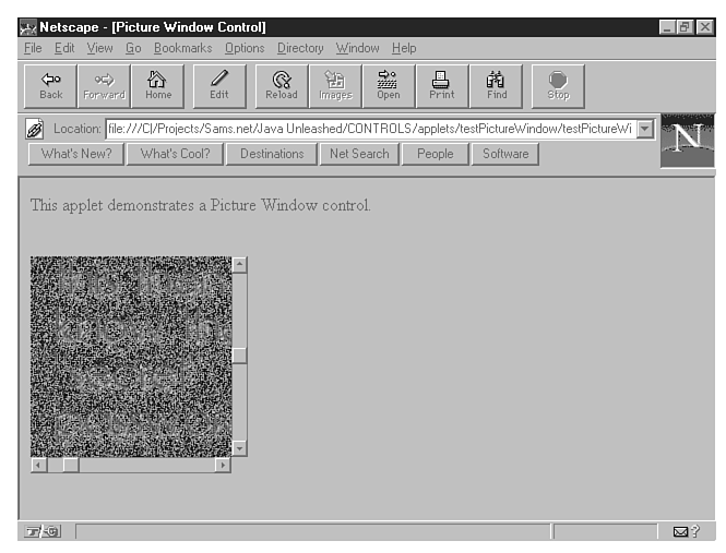 This composite control provides a self-contained way of displaying a picture. A user simply has to pass an Image object to the control and the control does the rest. The control handles scrolling and updating the image. Figure 21.2 shows the scrolling picture window applet.