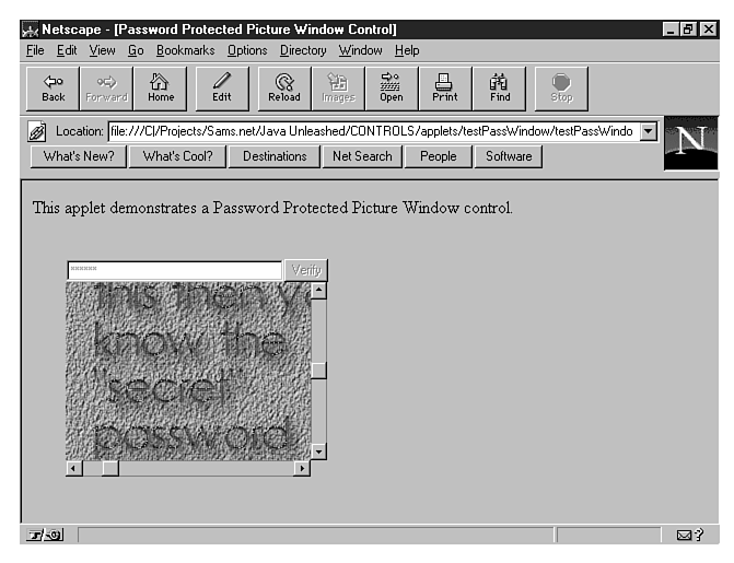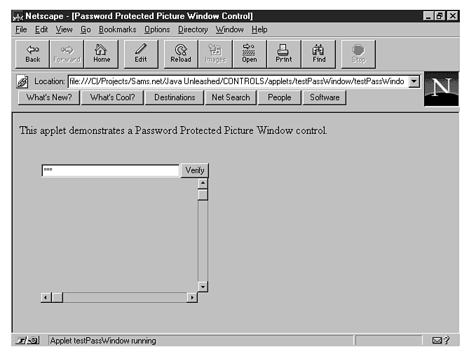 The versatility of composite, or extended, controls becomes apparent when they are combined into a single applet. The applet presented in this section is a password-protected picture control. This control combines a passField control with a ScrollingPictureWindow control. Figures 21.3 and 21.4 show the testPassWindow applet.