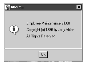 Should your jiflet be any different? You're just as proud of your creation as other authors are! Well, set a copyright message with the method setCopyright(), and an About dialog box displays automagically! Figure 40.3 shows the About dialog box for the employee maintenance program. Nothing too fancy, just the text and a little icon.