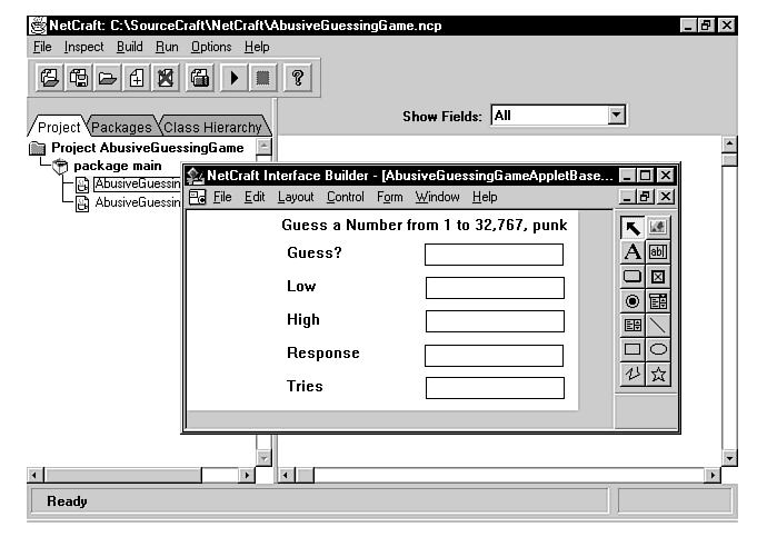 NetCraft, like Café and Java WorkShop, includes a way to visually develop a graphical user interface. The NetCraft UI Builder generates Java code that uses the abstract windowing toolkit as its raw material, so the code does not rely on any new classes introduced with the development environment. When you create an interface component, NetCraft generates source code for that component, complete with a TODO comment line where the event-handling code for that component is placed. It's a simpler approach than some of the alternatives and a programmer comfortable with the AWT should be comfortable with it.