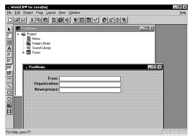 As software that strives to put nonprogrammers to work developing Java applets and applications, WinGEN puts its emphasis on its point-and-click approach to the creation of graphical user interfaces. Many simple user events can be created through WinGEN without writing any Java code; graphics and animation features can also be created without programming.