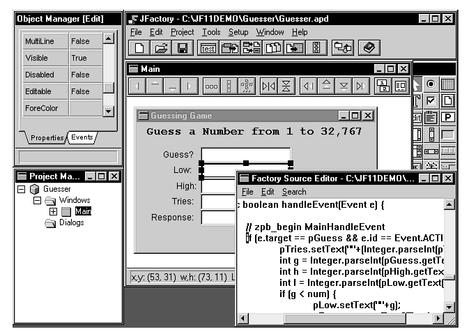 JFactory has a robust system for creating the interface: You can use drag-and-drop and mouse movements to place components, and you can also place components with numeric input. The height, width, and (x,y) coordinates of a component can be set from a properties dialog box. This approach makes it much easier to cure the problem of wandering components that are difficult to align correctly.
